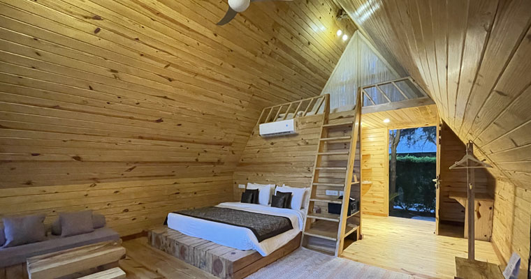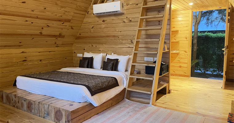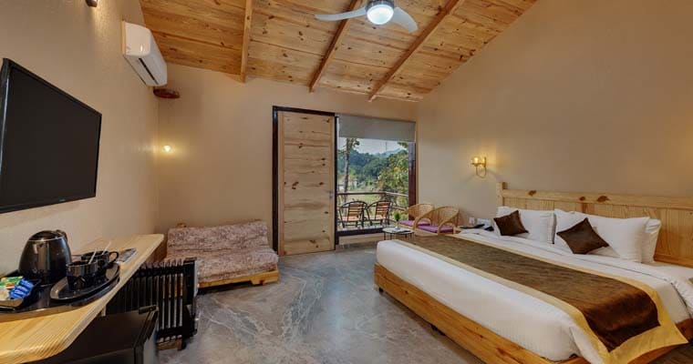 The Pine Cottage at Tarangi Resort & Spa offers a royal retreat with elegant interiors and breathtaking views of the Sitabani forest and Kosi River. Featuring a spacious master bedroom with a king-size bed and a private balcony, it’s perfect for relaxing amidst serene and luxurious natural surroundings.